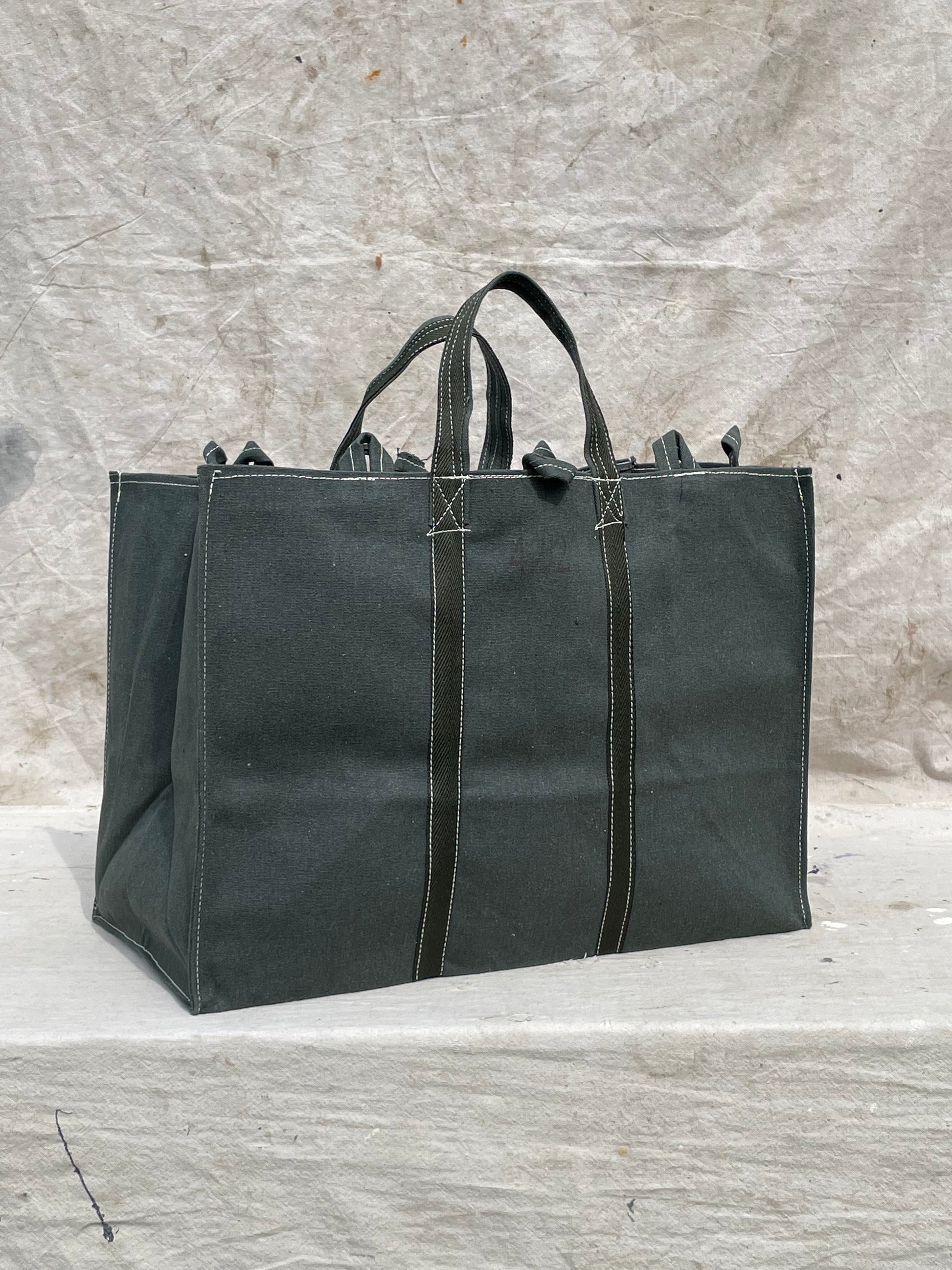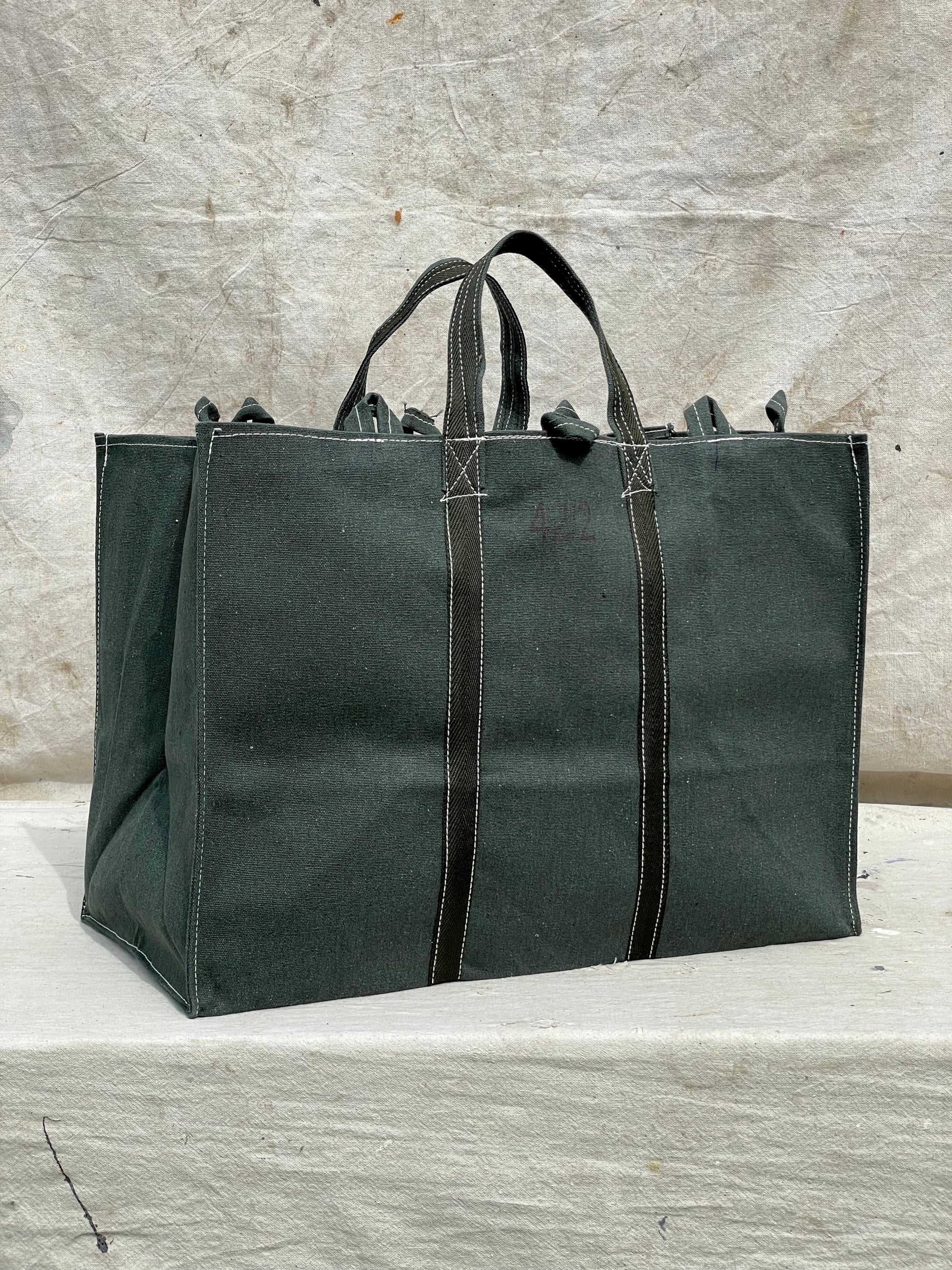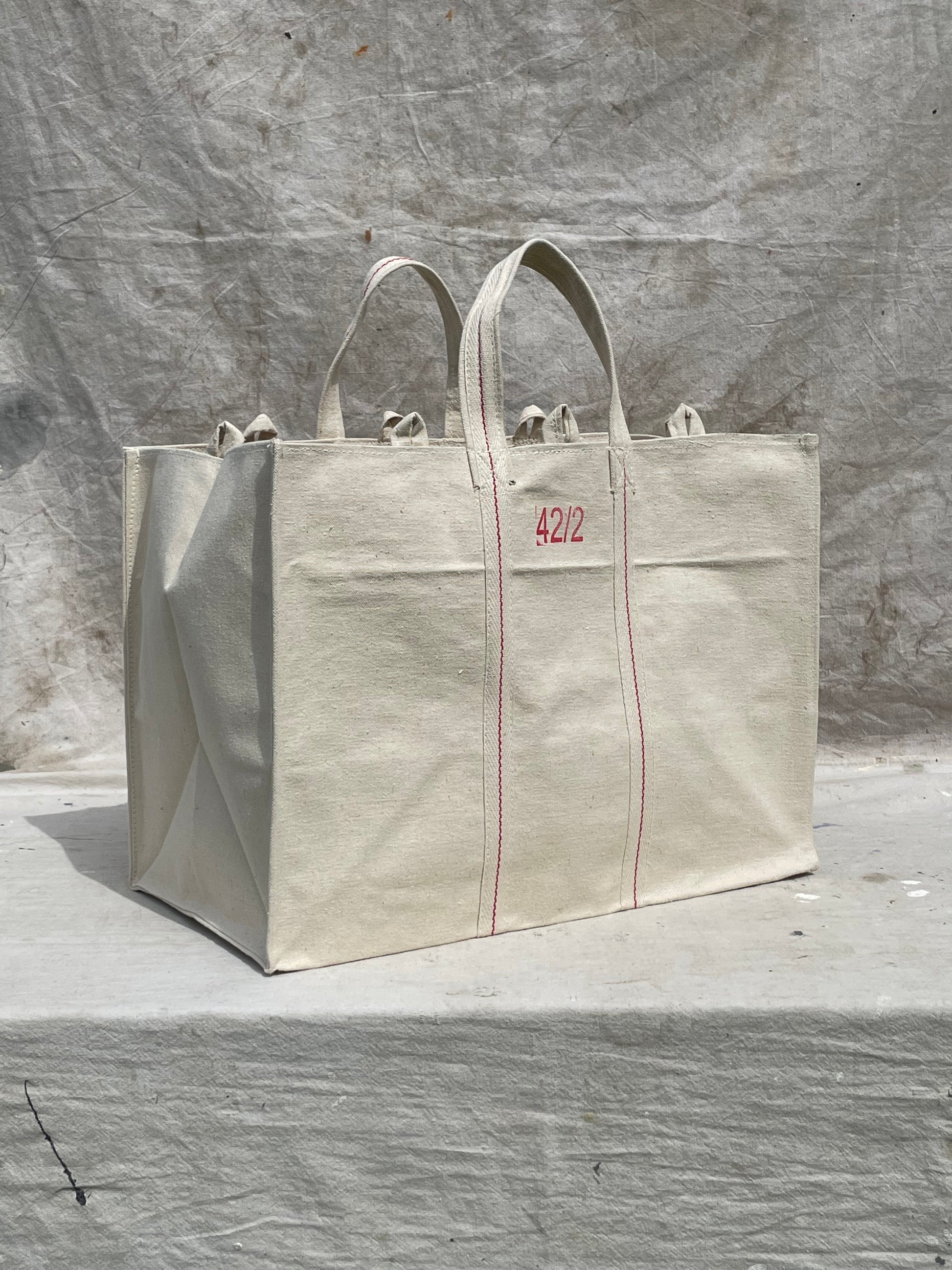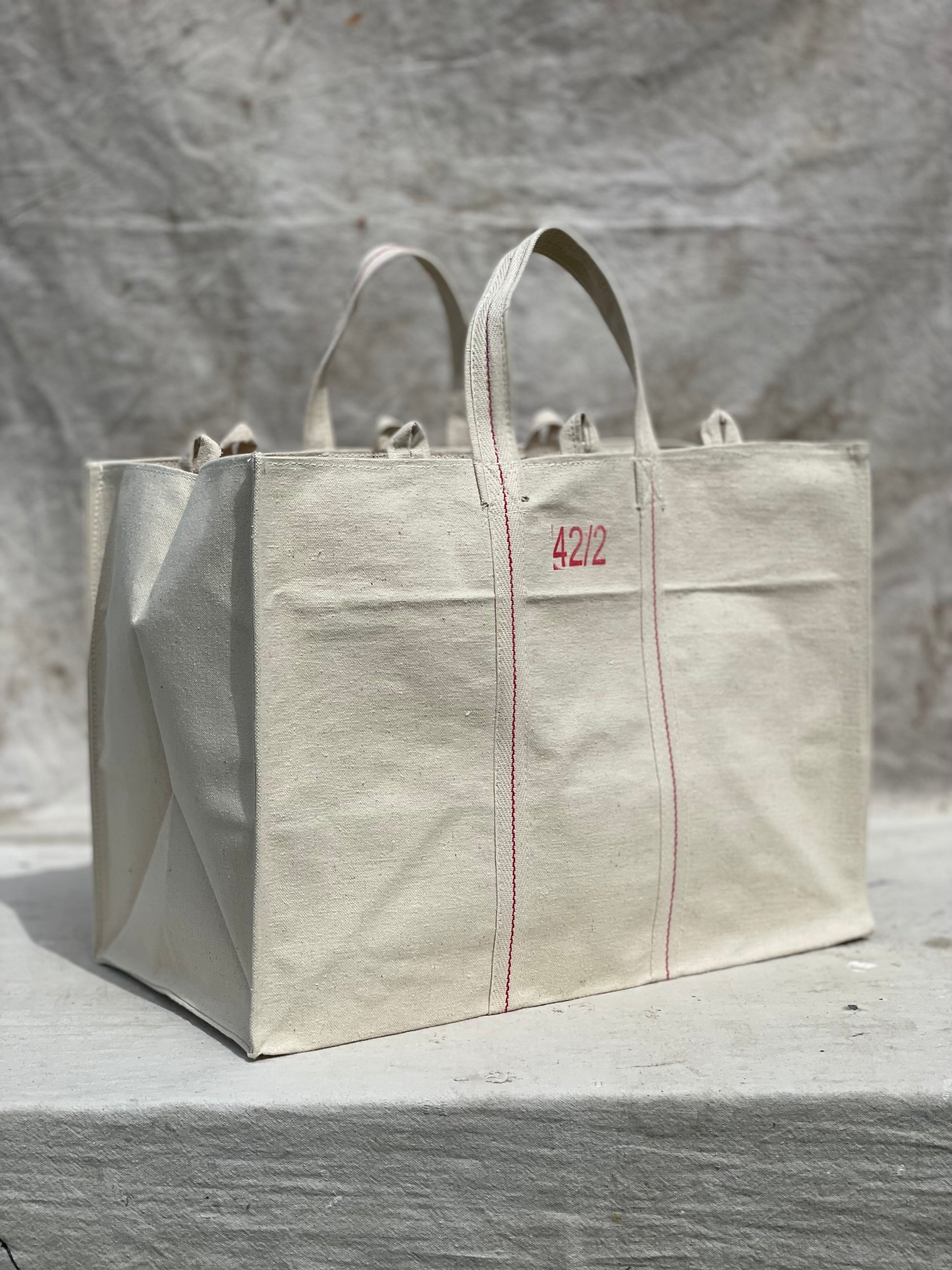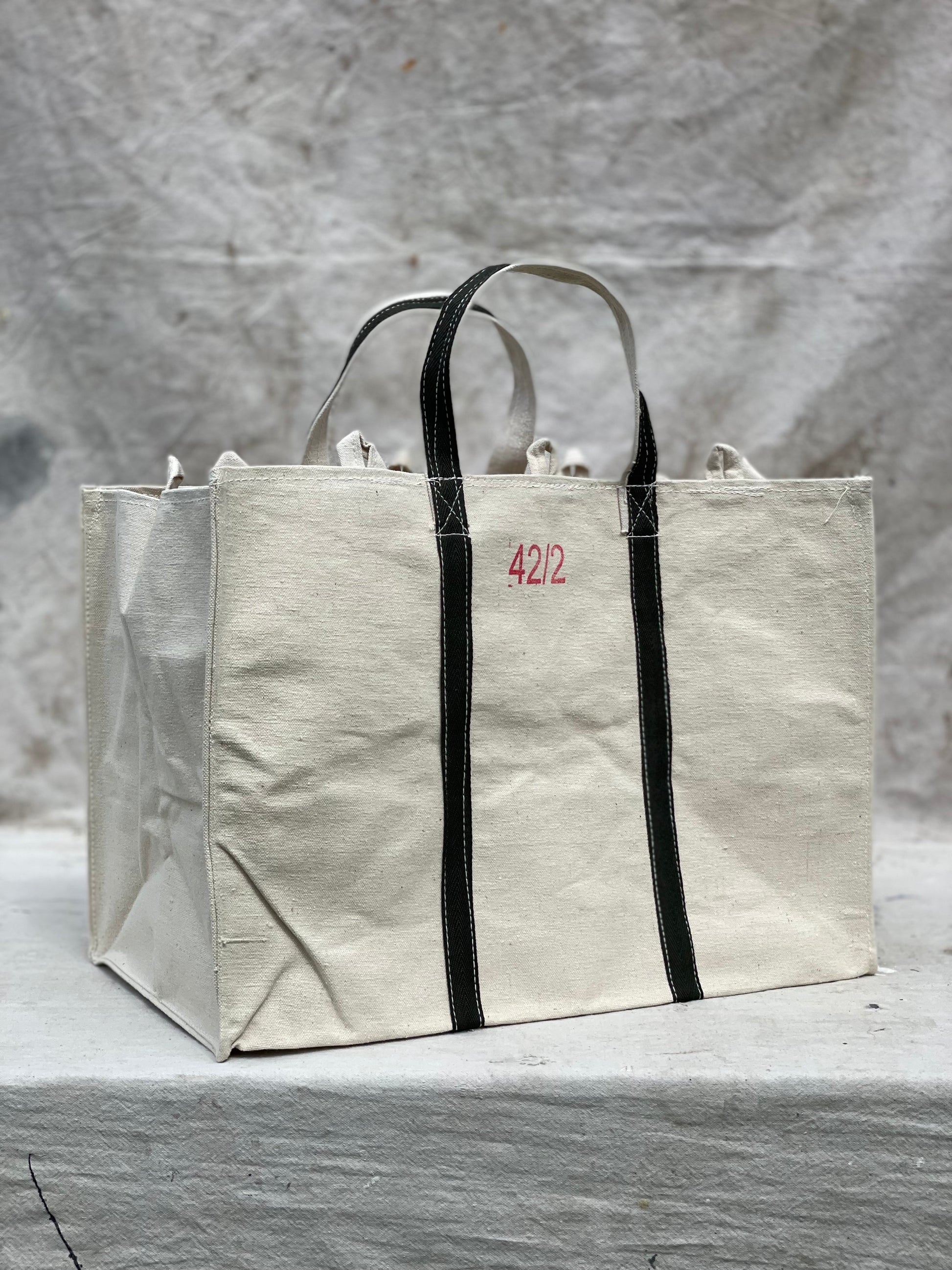Each bag is double-stitched by hand for durability and can hold a minimum weight of 100+ pounds. To prevent back injuries we have designed these to be carried on your arm with shorter handles to distribute the weight. The printed numbers on each bag is hand stamped by our artisans roughly indicating size.